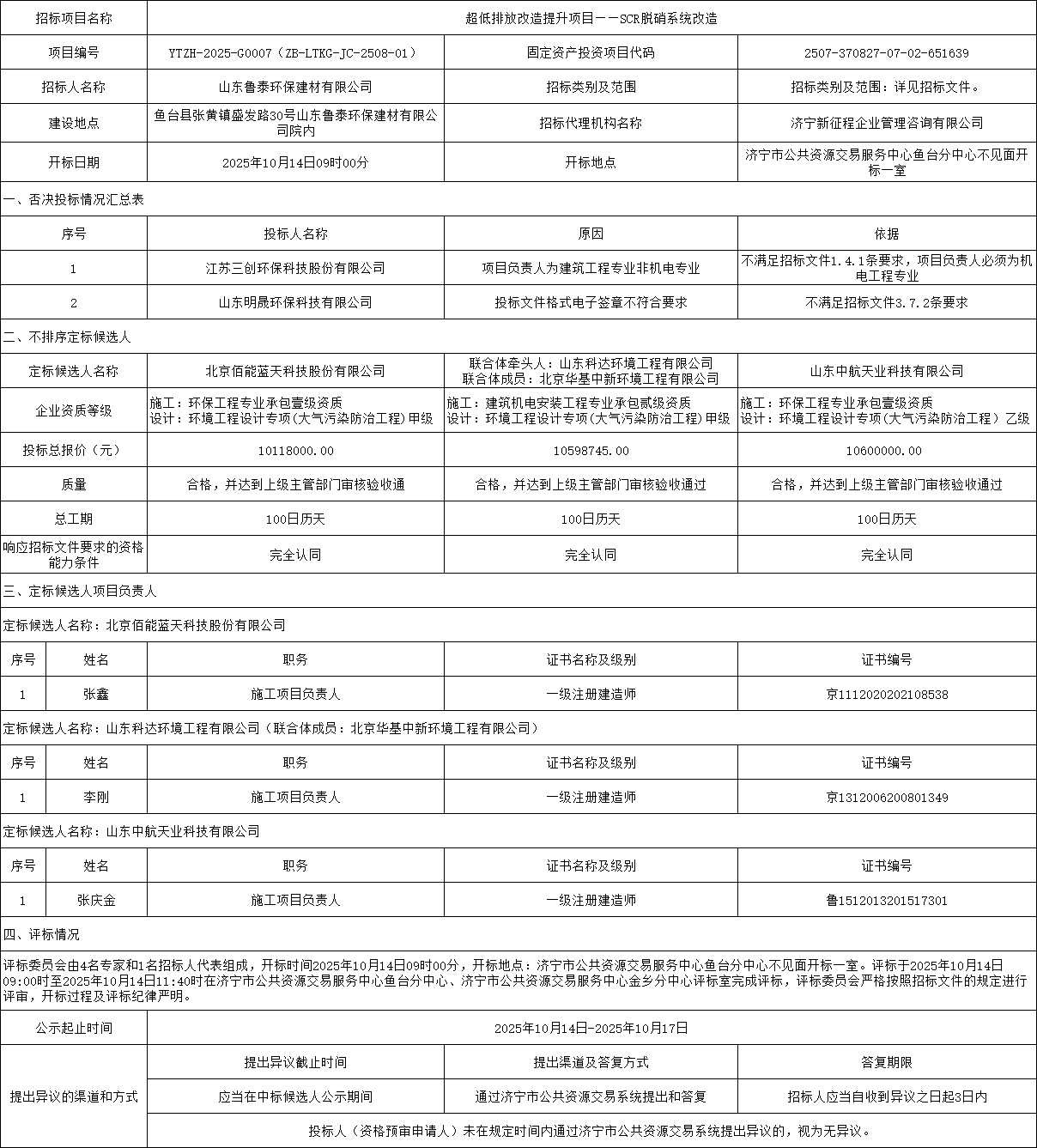 山东鲁泰环保建材有限公司2500t/d水泥熟料生产线超低排放改造提升项目-SCR脱硝系统改造定标候选人公示。