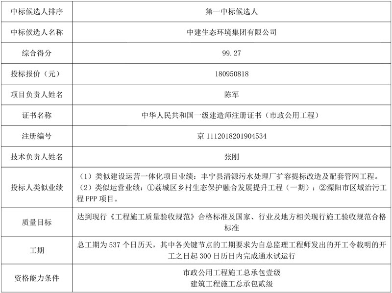 福建省集成电路工业园污水处理厂项目一期工程中标候选人公示。第一中标候选人:中建生态环境集团有限公司,投标报价:180950818元。