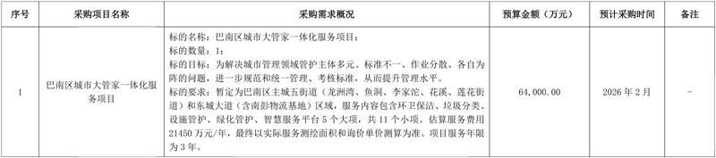 2026年1月20日,重庆市巴南区城市管理局发布巴南区城市大管家一体化服务项目采购意向。项目预算6.4亿元,预计采购时间为2月。