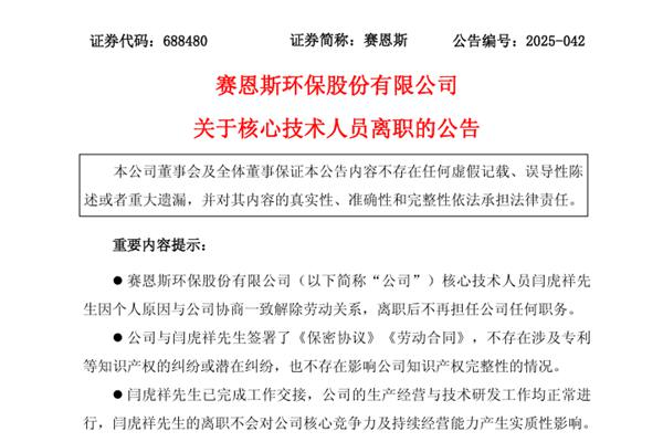 赛恩斯环保股份有限公司(简称:赛恩斯)近日公告称,公司核心技术人员闫虎祥先生因个人原因与公司协商一致解除劳动关系,离职后不再担任公司任何职务。目前,闫虎祥先生已完成工作交接,公司的生产经营与技术研发工作均正常进行,闫虎祥先生的离职不会对公司核心竞争力及持续经营能力产生实质性影响。