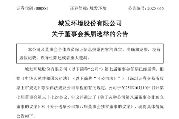 城发环境股份有限公司(简称:城发环境)公告称,公司于2025年10月10日召开第七届董事会第三十七次会议,审议并通过了《关于选举公司第八届董事会非独立董事的议案》和《关于选举公司第八届董事会独立董事的议案》,确认公司第八届董事会由9名董事组成,其中,非独立董事6名(含1名职工代表董事),独立董事3名。