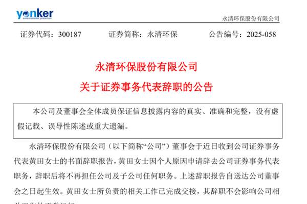 永清环保股份有限公司(简称:永清环保)公告称,公司董事会于近日收到公司证券事务代表黄田女士的书面辞职报告,黄田女士因个人原因申请辞去公司证券事务代表职务,辞职后将不再担任公司及子公司任何职务。目前,黄田女士所负责的相关工作已完成交接,其辞职不会影响公司相关工作的正常运行。
