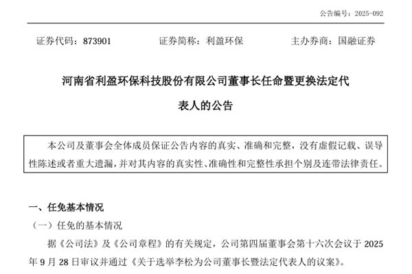 新三板上市公司河南省利盈环保科技股份有限公司(简称:利盈环保)公告称,公司第四届董事会第十六次会议于 2025年 9 月 28 日审议并通过《关于选举李松为公司董事长暨法定代表人的议案》。任命李松女士为公司董事长,任职期限至第四届董事会任期届满之日止,自 2025年 9 月 28 日起生效。上述任命人员持有公司股份 0 股,占公司股本的 0%,不是失信联合惩戒对象。