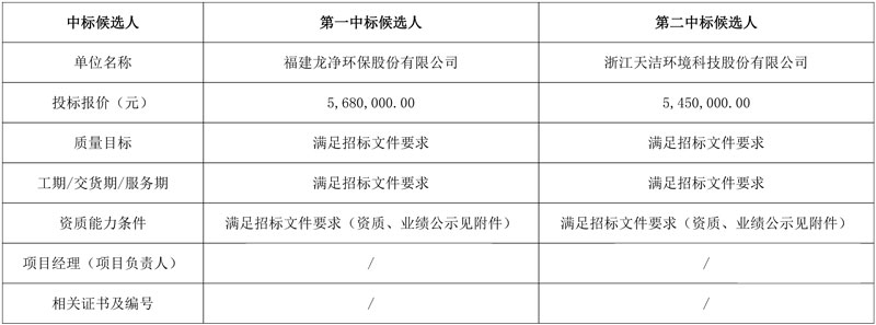 黑龙江伊品能源有限公司热电联产续建项目布袋除尘器设备招标(招标编号:0724-2520N1456391)项目的招标评标工作已经结束,共有6家投标人递交了投标文件,经评标委员会评审,共否决1家投标人投标文件。评标委员会经评审推荐了本项目中标候选人。现将中标候选人情况予以公示(公示时间从2025年10月14日00:00至2025年10月17日00:00止),具体内容如下: