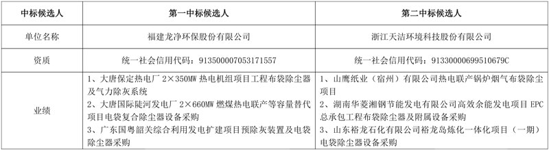 黑龙江伊品能源有限公司热电联产续建项目布袋除尘器设备招标中标候选人公示