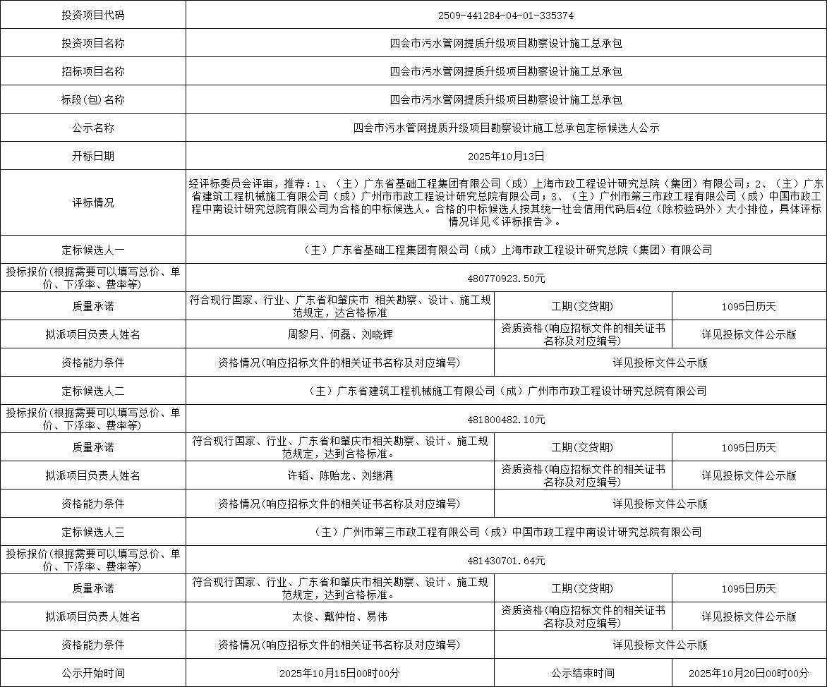广东省四会市污水管网提质升级项目勘察设计施工总承包发布定标候选人公示。(排序不分先后)