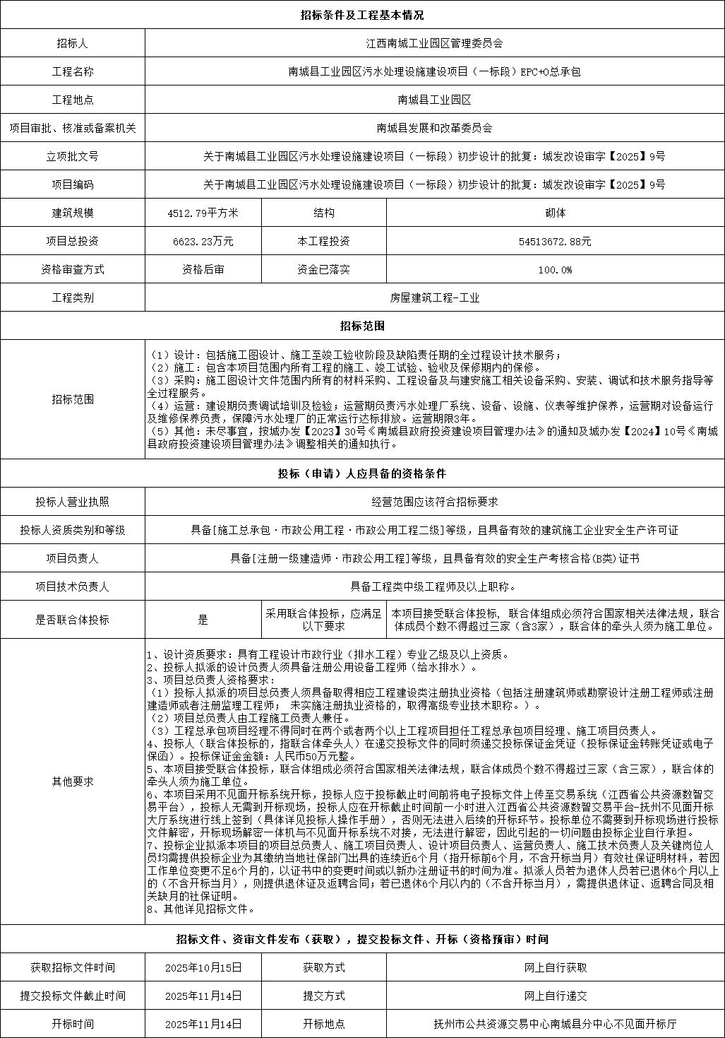 南城县工业园区污水处理设施建设项目(一标段)EPC+O总承包招标公告发布。