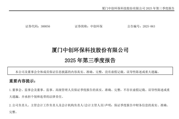 厦门中创环保科技股份有限公司(简称:中创环保)近日发布《2025年第三季度报告》。2025年前三季度,中创环保实现营业总收入2.58亿元,同比下降3.96%;归母净利润亏损4673.65万元,上年同期亏损1097.51万元;扣非净利润亏损5061.15万元,上年同期亏损4375.03万元;经营活动产生的现金流量净额为-4217.87万元,上年同期为-9710.57万元。
