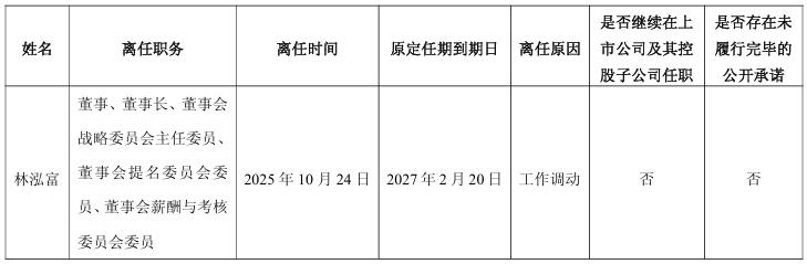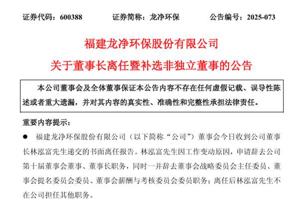 福建龙净环保股份有限公司(简称:龙净环保)近日公告称,公司已收到董事长林泓富先生递交的书面离任报告。林泓富先生因工作变动原因,申请辞去公司第十届董事会董事、董事长职务,同时一并辞去董事会战略委员会主任委员、董事会提名委员会委员、董事会薪酬与考核委员会委员职务;离任后林泓富先生不在公司担任其他职务。