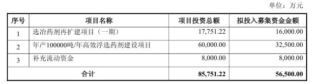 选冶药剂再扩建项目(一期)位于福建省龙岩市上杭县蛟洋镇坪埔村工业路秋竹片区,拟在现有产能基础上扩建,项目建设完成后可实现年产5000吨选冶药剂,将进一步提升公司现有选冶药剂的产能规模,尤其是铜萃取剂产能规模将得到进一步提升。本项目的建设符合行业发展趋势及公司战略发展方向,有利于公司业绩的持续增长,进一步巩固公司在该行业的地位,提升公司整体竞争力。总投资为17,751.22万元,拟使用募集资金投入16,000.00万元。