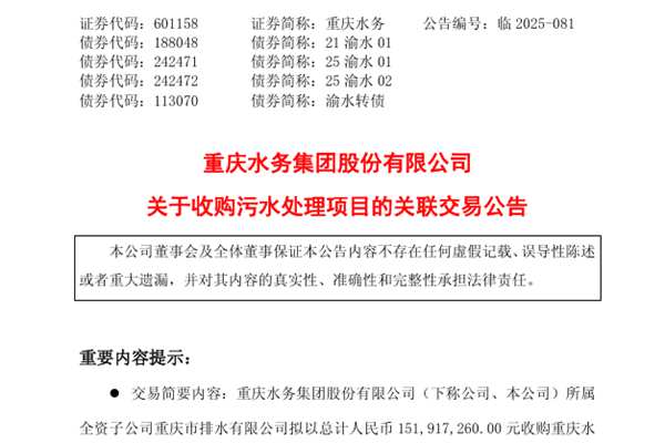 重庆水务集团股份有限公司(简称:重庆水务)近日公告称,全资子公司重庆市排水有限公司拟以总计人民币151,917,260.00元收购重庆水务环境控股集团有限公司(下称“重庆水务环境集团”)建设的井口污水处理厂三期扩建工程、土主污水处理厂提标改造工程的资产以及与其相关的债权债务。本次交易构成关联交易,不构成重大资产重组。