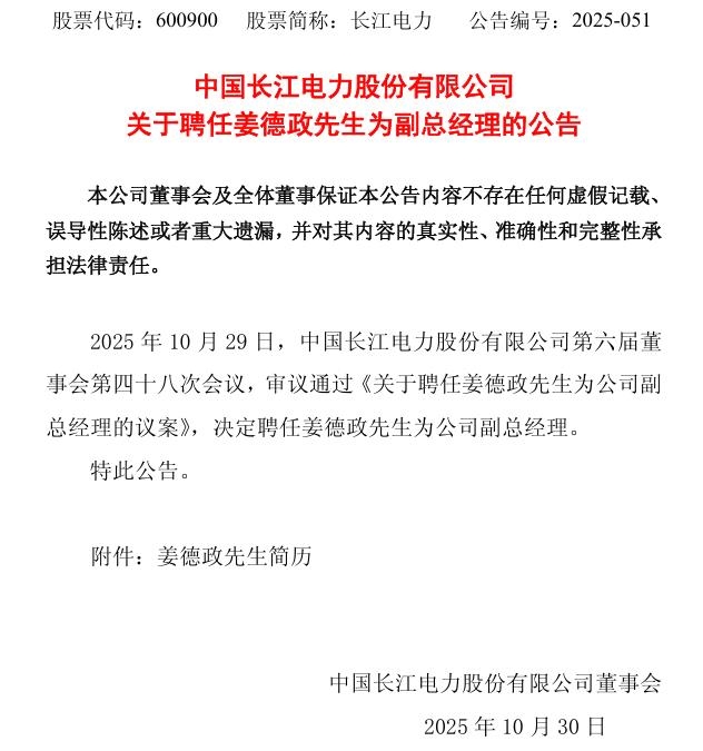 中国长江电力股份有限公司(简称:长江电力)近日公告称,公司第六届董事会第四十八次会议审议通过了《关于聘任姜德政先生为公司副总经理的议案》,决定聘任姜德政先生为公司副总经理。