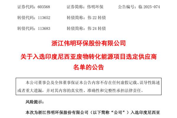 浙江伟明环保股份有限公司(简称:伟明环保)公告称,公司近日收到印度尼西亚主权投资基金PT Danantara Investment Management 发来的通知,确定公司正式入选印度尼西亚环境友好型废物转化能源项目选定供应商名单。