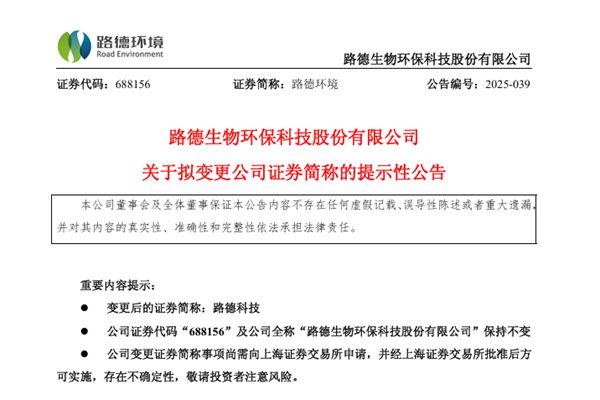 路德生物环保科技股份有限公司(简称:路德环境)近日公告称,公司第五届董事会第五次会议审议通过了《关于拟变更公司证券简称的议案》,同意将公司证券简称由“路德环境”变更为“路德科技”,公司全称和证券代码保持不变。本次拟变更证券简称事项无需提交公司股东会审议。