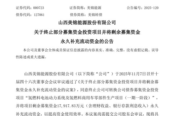 山西美锦能源股份有限公司(简称:美锦能源)公告称,公司于2025年11月7日召开十届四十六次董事会会议,审议通过了《关于终止部分募集资金投资项目并将剩余募集资金永久补充流动资金的议案》,同意终止公司可转换公司债券募集资金投资项目“氢燃料电池动力系统及氢燃料商用车零部件生产项目(一期一阶段)”,并将项目剩余募集资金17,917.83万元(含理财收益、银行存款利息收入)永久补充流动资金,以提高资金使用效率。