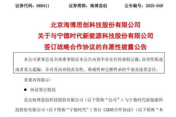 北京海博思创科技股份有限公司(简称:海博思创)近日公告称,公司与宁德时代新能源科技股份有限公司(下称“宁德时代”)签订《战略合作协议》(下称“本协议”),在2026年1月1日至2035年12月31日合作期内,双方应于每年度末(12月1日前)就未来三年的合作目标进行滚动式更新,并签署相应年限的合作备忘录予以确认。其中2026年1月1日至2028年12月31日,公司采购电量累计不低于200GWh,宁德时代确保按公司需求量纲供应。