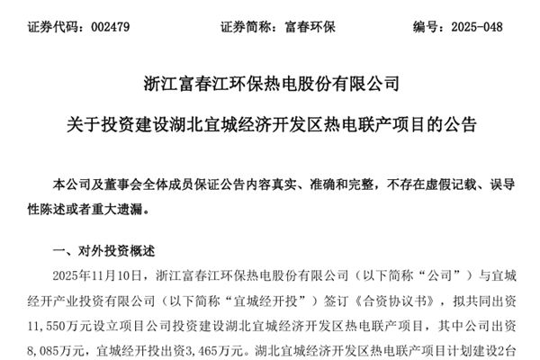 浙江富春江环保热电股份有限公司(简称:富春环保)近日公告称,公司与宜城经开产业投资有限公司(下称“宜城经开投”)签订《合资协议书》,拟共同出资11,550万元设立项目公司投资建设湖北宜城经济开发区热电联产项目,其中公司出资8,085万元,宜城经开投出资3,465万元。湖北宜城经济开发区热电联产项目计划建设2台100t/h高温超高压燃煤循环流化床锅炉配套1台12MW背压机组,预计总投资额约为3.85亿元。