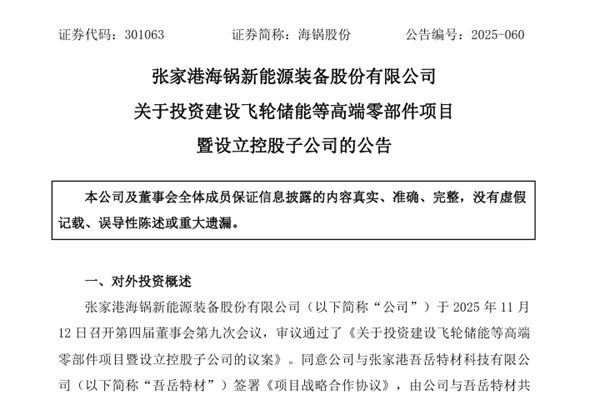 张家港海锅新能源装备股份有限公司(简称:海锅股份)公告称,公司于2025年11月12日召开第四届董事会第九次会议,审议通过了《关于投资建设飞轮储能等高端零部件项目暨设立控股子公司的议案》: