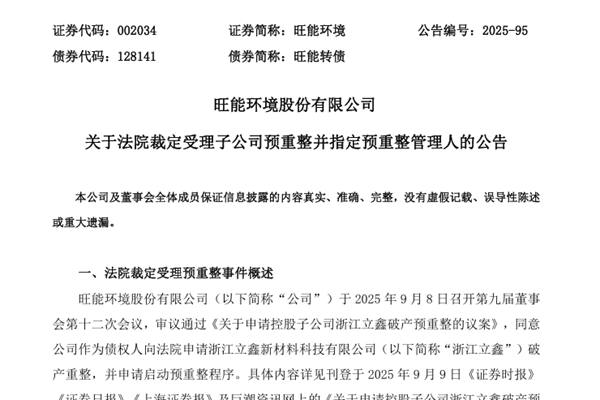 旺能环境股份有限公司(简称:旺能环境)公告称,11月12日,公司收到了德清法院送达的《决定书》(2025)浙0521 破申36号,同意浙江泽大(湖州)律师事务所担任浙江立鑫新材料科技有限公司(下称“浙江立鑫”)预重整期间的临时管理人。