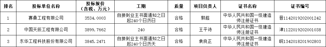 第二中标候选人:中国天辰工程有限公司,投标报价:3899.7662万元;