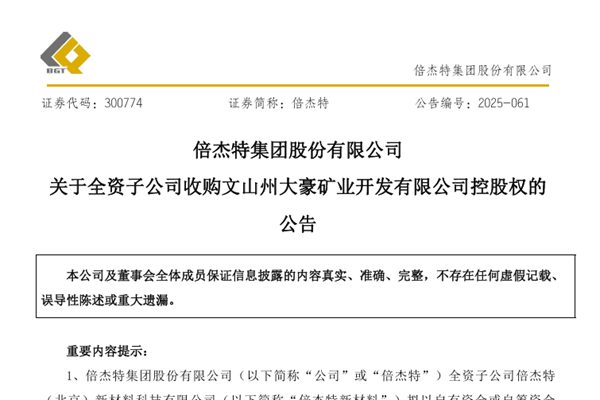 近2.25亿元!倍杰特拟收购大豪矿业55%股权 从末端“回收”环节逆向整合构建锑全产业链