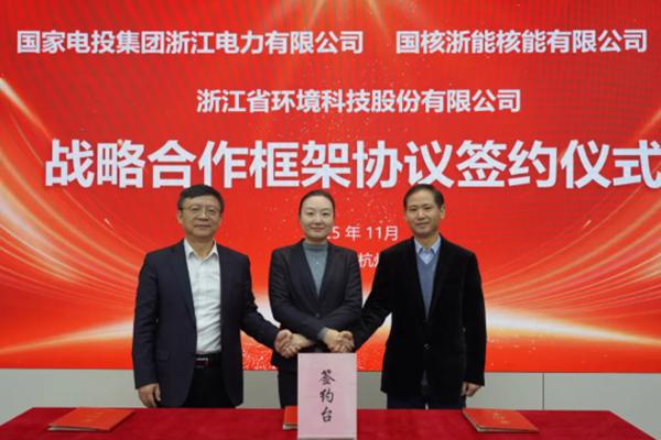 2025年11月18日,浙江省环境科技股份有限公司与国家电投集团浙江电力有限公司、国核浙能核能有限公司举行战略合作框架协议签约仪式。三方将围绕环保咨询、环保管理、绿色低碳等领域开展深度合作,共同构建“能源+环保”融合发展新格局,助力绿色能源体系建设迈上新台阶。