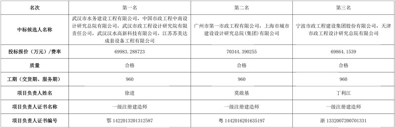 中标候选人第一名:武汉市水务建设工程有限公司、中国市政工程中南设计研究总院有限公司、武汉市政工程设计研究院有限责任公司、武汉汉水高新科技有限公司、江苏苏美达成套设备工程有限公司,投标报价:69983.288723万元;