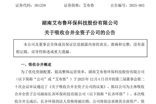 湖南艾布鲁环保科技股份有限公司(简称:艾布鲁)公告称,为了优化资源配置,提高整体运营效率,公司于2025年12月4日召开的第三届董事会第二十次会议审议通过了《关于吸收合并全资子公司的议案》,拟以公司为主体吸收合并全资子公司湖南长齐环保科技有限公司(下称“长齐环保”)。本次吸收合并完成后,长齐环保的法人资格将被注销,公司将依法承继其全部资产、债权债务、合同关系等权利与义务。