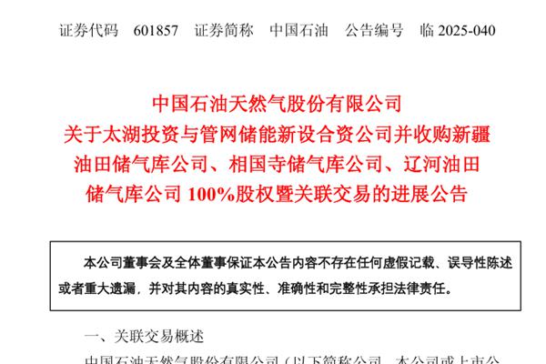 2025年12月4日,中石油新疆储气库与新疆石油管理局有限公司(新疆石油管理局)正式签署《股权收购合同》,中石油相国寺储气库与四川石油管理局有限公司(四川石油管理局)正式签署《股权收购合同》,中石油辽宁储气库与辽河石油勘探局有限公司(辽河石油勘探局)正式签署《股权收购合同》。