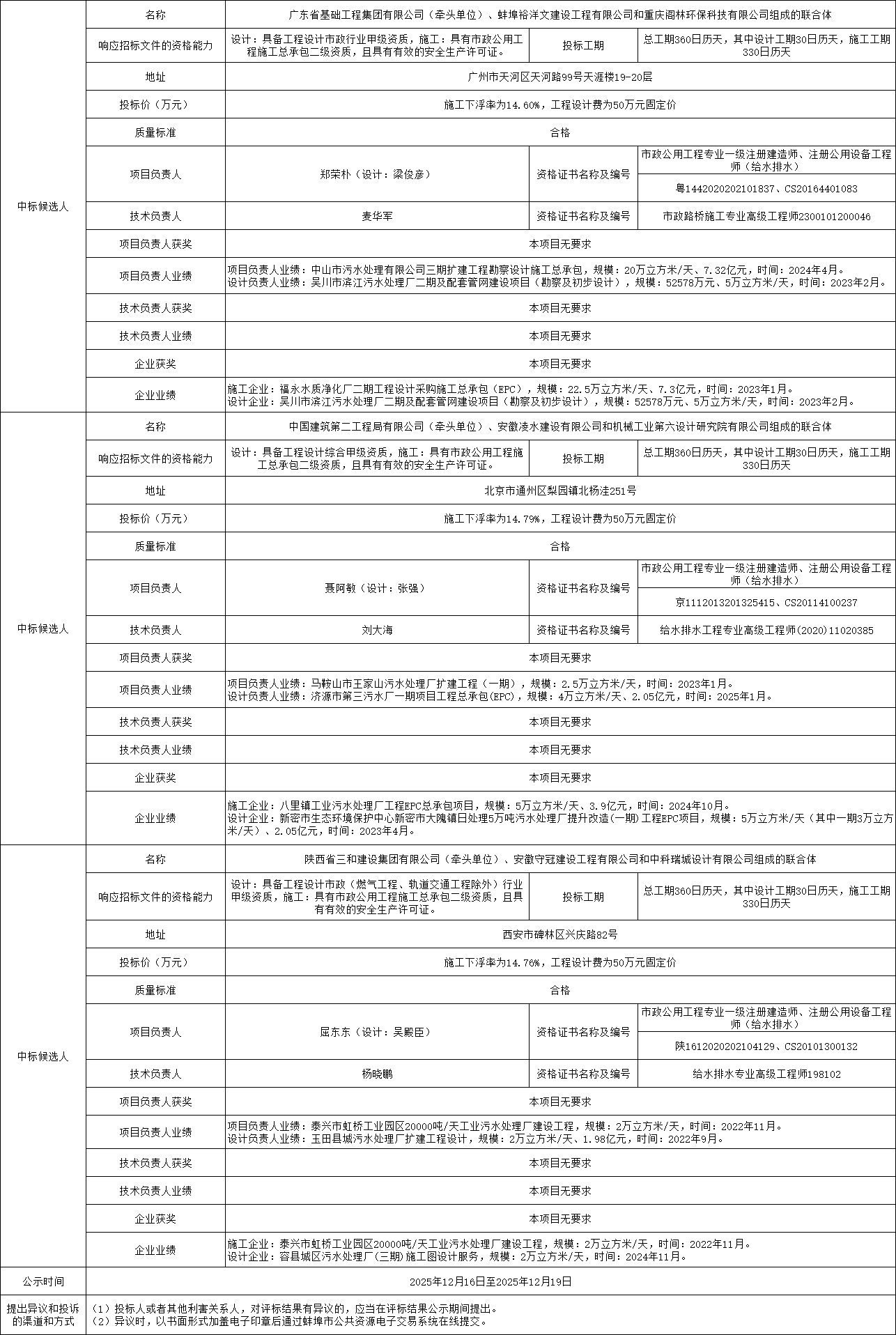 蚌埠市龙子湖区工业污水处理厂建设EPC项目中标候选人公示BB2025SQGCZ1931