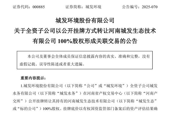 经河南产交所确认,河南城市发展投资有限公司(下称“城发投资”)作为唯一意向受让方报名参与并根据挂牌条件缴纳了保证金,成为本次挂牌的受让方,其拟以挂牌底价受让城发生态100%股权。本次交易完成后,城发生态不再纳入城发环境合并报表范围。