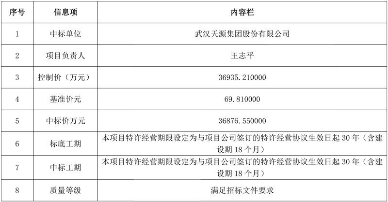 中标人:武汉天源集团股份有限公司(含联合体:上海康恒环境股份有限公司)