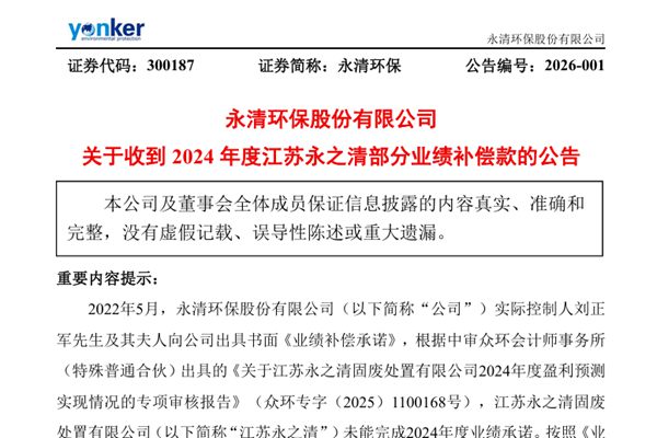 近日,永清环保股份有限公司(简称:永清环保)公告称,公司已收到2024年度江苏永之清固废处置有限公司(下称“江苏永之清”)部分业绩补偿款2600万元。此次补偿源于公司实控人刘正军及其夫人此前出具的业绩承诺,因江苏永之清未完成2024年度业绩目标,二人需向公司合计补偿7322.62万元。