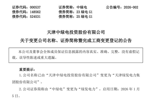 天津中绿电投资股份有限公司(简称:绿发电力)近日公告称,公司名称已由“天津中绿电投资股份有限公司”变更为“天津绿发电力集团股份有限公司”;证券简称由“中绿电”变更为“绿发电力”,启用日期:2026年1月5日;证券代码“000537”保持不变。