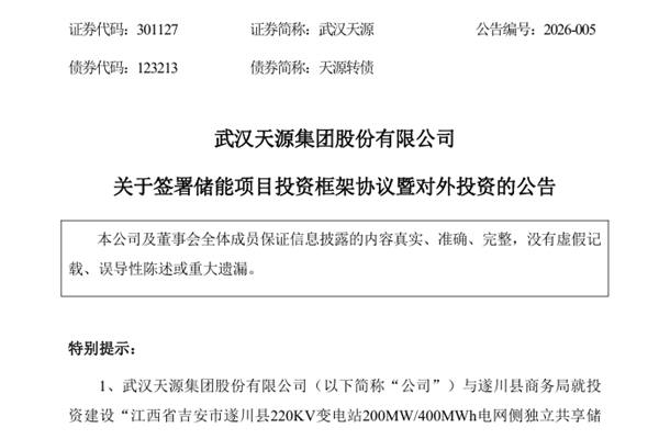 武汉天源集团股份有限公司(简称:武汉天源)近日公告称,公司与遂川县商务局就投资建设“江西省吉安市遂川县220KV变电站200MW/400MWh电网侧独立共享储能项目”(以下简称“项目”)签署《江西省吉安市遂川县220KV变电站200MW/400MWh电网侧独立共享储能项目投资框架协议》(下称“《投资框架协议》”),项目总投资约5.5亿元,由公司自筹。项目计划2026年开工建设,建设工期为4个月。