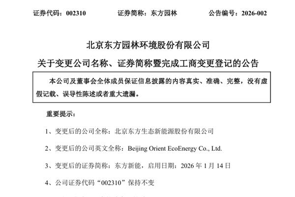 北京东方园林环境股份有限公司(简称:东方园林)近日公告称,公司持续推进《北京东方园林环境股份有限公司重整计划》,全面转型至以风光电储为核心的新能源领域,现新能源业务已成为公司增长的核心引擎和未来发展的主要方向。为使公司名称更加契合公司当前的实际情况与长远发展战略,与战略方向、主营业务结构及未来发展规划更为匹配,提升公司的品牌辨识度和市场影响力,强化投资者对公司价值的准确认知,公司对现有名称及证券简称进行变更。