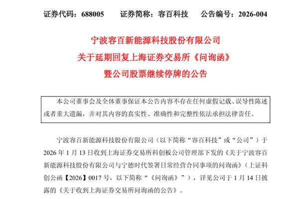 对此,容百科技回应称,为了保证信息披露的公平性,经公司向上海证券交易所申请,公司股票(简称“容百科技”,代码:688005)已于2026年1月14日停牌一天。收到《问询函》后,公司积极组织管理层及相关方按照要求逐项认真准备答复工作,鉴于《问询函》涉及的部分事项需要进一步落实,公司股票于2026年1月15日将继续停牌1日。