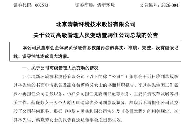 此前,清新环境董事会收到总裁李其林先生的书面申请报告及副总裁蔡晓芳女士的书面辞职报告。李其林先生因工作需要不再担任公司总裁职务,仍在公司担任党委副书记等职务,主要负责改革发展等相关工作。蔡晓芳女士因个人原因申请辞去公司副总裁职务,辞职后不再担任公司及控股子公司任何职务。根据《中华人民共和国公司法》及《公司章程》的相关规定,李其林先生、蔡晓芳女士的报告自送达董事会之日起生效。