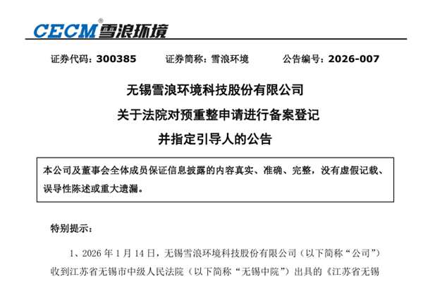 无锡雪浪环境科技股份有限公司(简称:雪浪环境)公告称,公司于2026年1月14日收到江苏省无锡市中级人民法院(以下简称“无锡中院”)送达的《通知书》,无锡中院就申请人对公司的预重整申请进行备案登记。具体内容如下:依照《无锡市中级人民法院预重整工作指引(试行)》之规定,无锡中院同意对公司预重整予以备案登记,并同意公司聘请江苏联盛(无锡)律师事务所、北京市金杜律师事务所共同担任预重整引导人,协助开展相关预重整工作。
