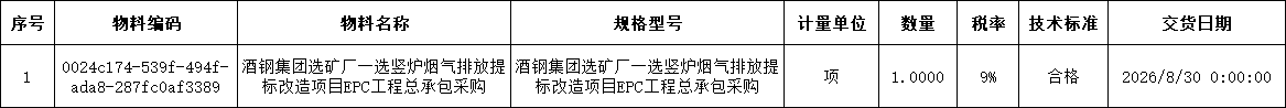 2026年1月15日,酒钢集团宏兴钢铁股份有限公司选矿厂一选竖炉烟气排放提标改造项目EPC工程总承包采购招标公告发布。
