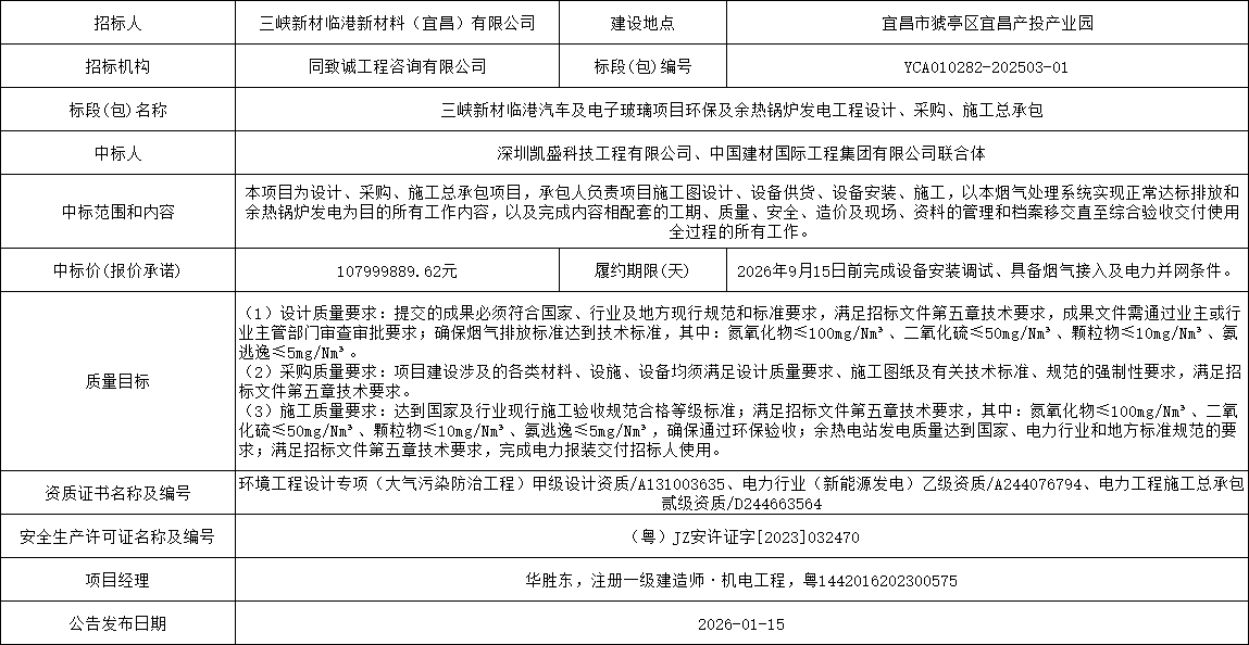 2026年1月15日,三峡新材临港汽车及电子玻璃项目环保及余热锅炉发电工程设计、采购、施工总承包中标结果公告发布。深圳凯盛科技工程有限公司、中国建材国际工程集团有限公司联合体中标,中标价:107999889.62元。