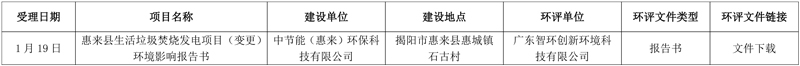 2016年1月16日,广东省惠来县生活垃圾焚烧发电项目(变更)环境影响报告书受理公示。