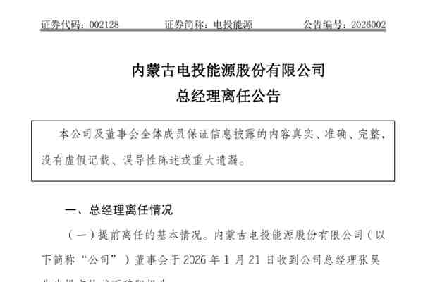 内蒙古电投能源股份有限公司(简称:电投能源)公告称,公司董事会于2026年1月21日收到公司总经理张昊先生提交的书面辞职报告。