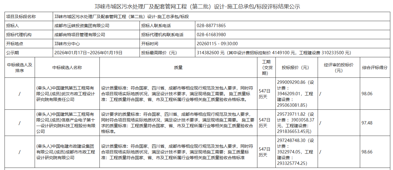 (牵头人)中国电建市政建设集团有限公司,(成员)成都市市政工程设计研究院有限公司,投标报价297248748.30元(设计费 :3922974.05,工程建设费 :293325774.25),综合评标得分98.66。