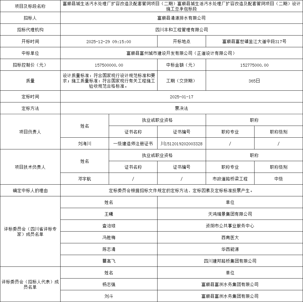 富顺县城生活污水处理厂扩容改造及配套管网项目(二期)设计施工总承包标段中标结果公示