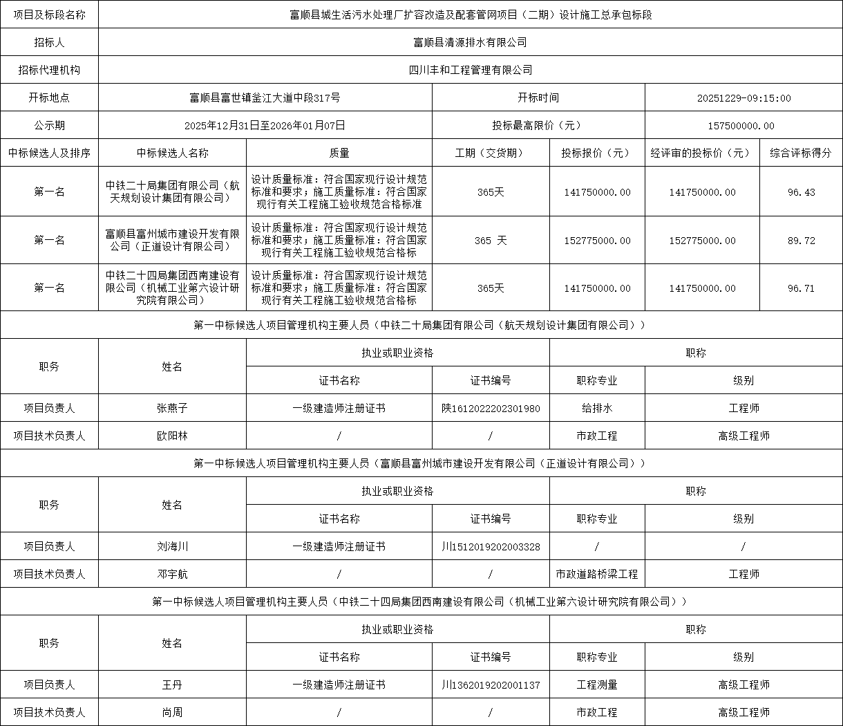 富顺县城生活污水处理厂扩容改造及配套管网项目(二期)设计施工总承包标段评标结果公示