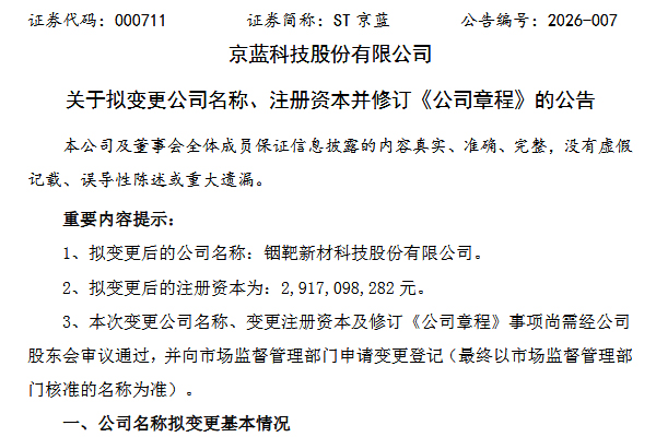 2026年1月24日,ST京蓝公告称,公司第十一届董事会第二十四次临时会议同意将公司名称由“京蓝科技股份有限公司”变更为“铟靶新材科技股份有限公司”。变更后的注册资本为29.17亿元。公司证券代码保持不变,证券简称待公司名称变更完毕后向交易所提交申请进行相应变更。