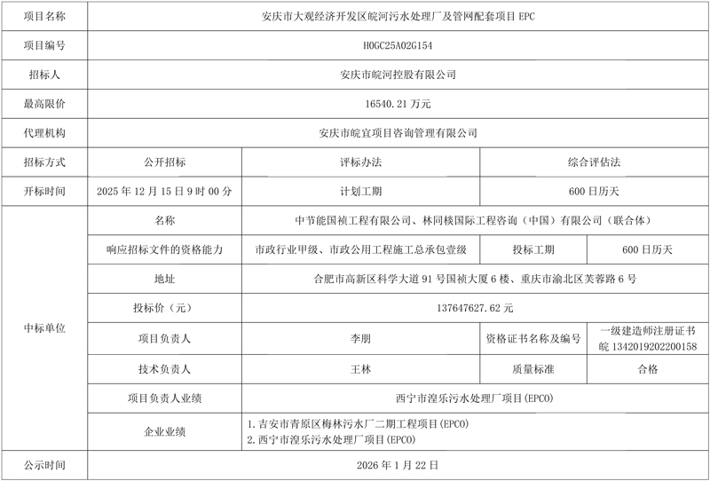 2026年1月22日,安徽省安庆市大观经济开发区皖河污水处理厂及管网配套项目EPC中标结果公示。中节能国祯工程有限公司、林同棪国际工程咨询(中国)有限公司联合体中标,投标价:137647627.62元。
