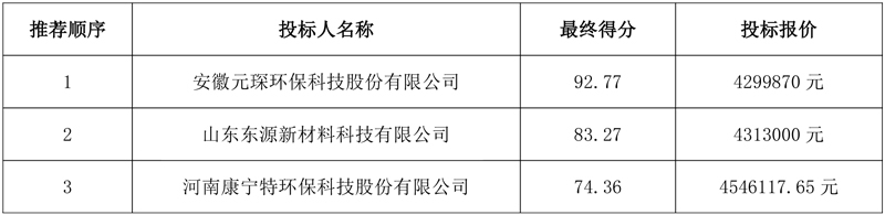 第一中标候选人:安徽元琛环保科技股份有限公司,投标报价:4299870元,单价:19939元/立方米