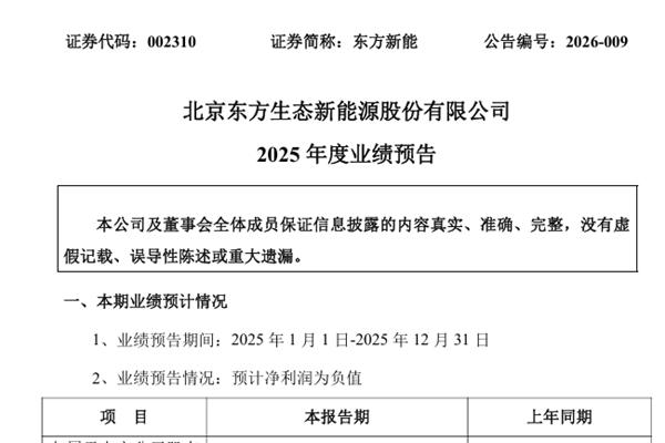 近日,北京东方生态新能源股份有限公司(简称:东方新能)发布《2025年度业绩预告》。报告期内,东方新能预计实现归属于上市公司股东的净利润亏损5,500万元–7,500 万元,上年同期亏损360,347.50 万元;扣除非经常性损益后的净利润亏损4,500万元–6,000 万元,上年同期亏损495,515.61 万元;基本每股收益亏损0.0100元/股–0.0140元/股,上年同期亏损0.76元/股。